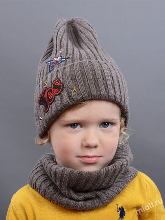 Демисезонная шапочка удлиненной формы, связанная в резинку. Широкий отворот декорирован шевроном.