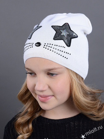 Полушерстяная шапочка удлиненной формы . Подойдет девочке-подростку для весенне-осеннего периода. По низу изделия узкая резинка. Декорирована нашивками в виде звездочек из пайеток и страз.