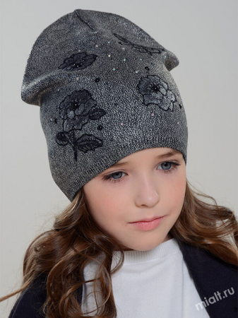 Полушерстяная шапочка удлиненной формы. Эффектный металлический блеск нанесен техникой фольгирования. Декорирована аппликациями.,стразами и полужемчугом.