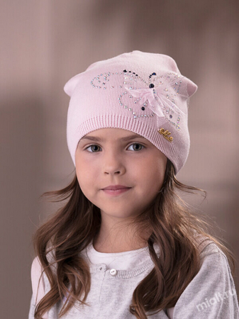 Хлопковая шапочка с объемным декором в виде бабочки из страз, пришивных камушков и фатина. Декоративная композиция выполнена вручную. Металлическая нашивка бренда производителя.