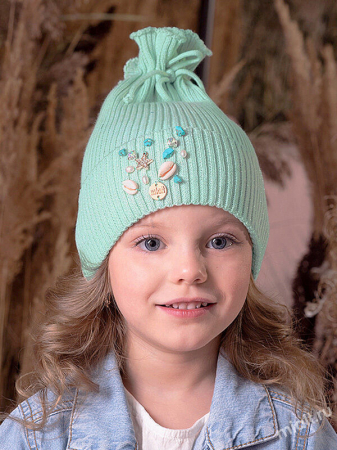 Оригинальная эластичная шапочка из хлопка, связанная в резинку. Модель, имитирующая мешочек на завязке. Отворот декорирован композицией морской тематики из натуральных ракушек, камушков, жемчужных бусин, стразовых камней в оправе и подвески в виде звездочки. Подойдет девочке до 5 лет.