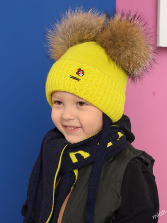 Дополнение: Комплект шапка+шарф. Шапка на подкладке с утеплителем, с отворотом, с завязками. Помпоны из натурального меха на кнопке. Шарф двухслойный с жаккардовыми буквами контрастных цветов