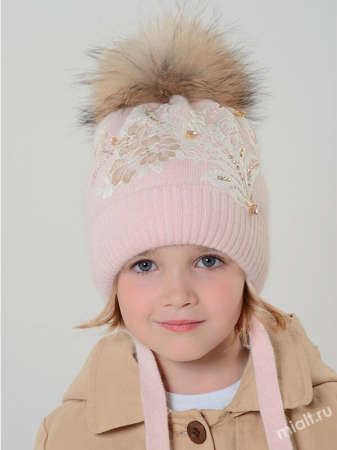 Дополнение: Для девочки. Удлиненная форма. Завязки. Отворот. Утеплитель. Подкладка. Помпон из натурального меха енота, на кнопке. Декор- аппликация из кружева, камни в оправе.