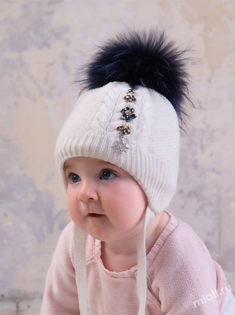 Дополнение: Для девочки, с отворотом, завязки, подкладка, утеплитель, помпон – мех натуральный крашеный на кнопке. Декор- композиция из страз, бусин, камней, подвеска.