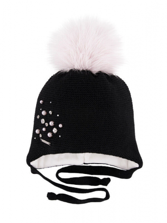 Теплая зимняя шапочка для девочки 1-3 лет с завязками и помпоном из натурального меха. Декорирована жемчугом и стразами. Подкладка 100% хлопок, утеплитель Shelter.