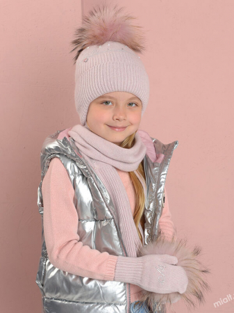 Дополнение: Комплект из трех предметов- шапка, шарф и варежки. Шапка на подкладке с утеплителем, с отворотом, с завязками. Помпон на кнопке натуральный енот. Декор- стразовая композиция, подвеска. Шарф- два помпона на кнопках - такие же, как на шапке. Декор- стразовая композиция. Варежки- двойные, соединены вязаным шнуром. Декор- стразовые композиции.