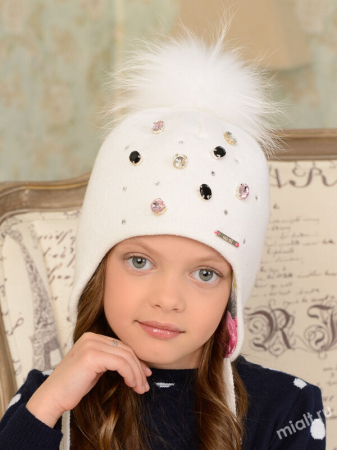 Зимняя шапочка с кроеными ушками и вшитыми завязками . Цветная трикотажная хлопковая подкладка. Декорирована пришивными камушками крупной огранки. Благодаря утеплителю Shelter-kids с максимальной степенью теплозащиты при минимальном объеме, шапочка тонкая, легкая и теплая. Помпон из натурального меха отстегивается на кнопке.
