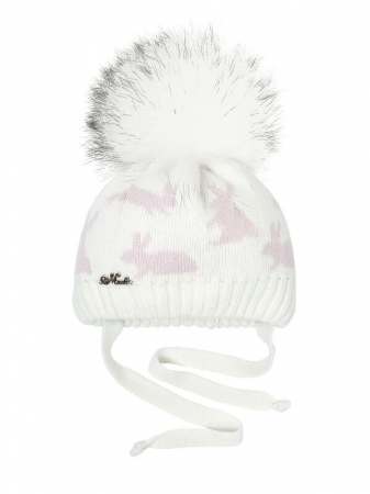 Шапочка с резинкой по низу изделия и вшитыми завязками. Жаккардовый рисунок в виде зайчиков. Отстегивающийся помпон на кнопке из натурального меха енота. Благодаря составу, утеплителю Shelter и хлопковому подкладу, шапка сохраняет тепло в самую прохладную погоду.