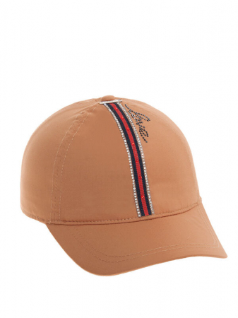 Бейсболка из 6 клиньев с жёстким козырьком. В затылочной части хлястик с металлической застежкой, позволяющей регулировать ширину. Декорирована тесьмой и стразовой композицией.