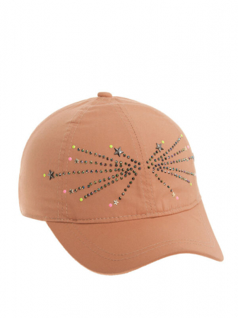 Бейсболка для девочки из 6 клиньев. Жёсткий козырек. В затылочной части хлястик на металлической застежке, позволяющей регулировать ширину. Декорирована стразовой композицией.