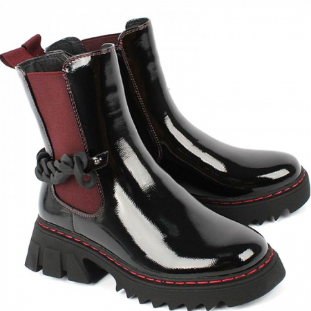 Модель выполнена из лакированной экокожи черного цвета и удобно фиксируется на боковую молнию. Подкладка и стелька из утепленного баечного текстиля обеспечат тепло и комфорт детским ножкам во время носки.