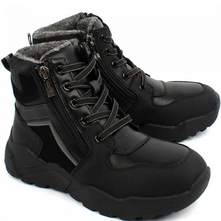 Модель выполнена из экокожи черного цвета и удобно фиксируется на шнуровку и боковую молнию. Подкладка и стелька из утепленного баечного текстиля обеспечат тепло и комфорт детским ножкам во время носки.
