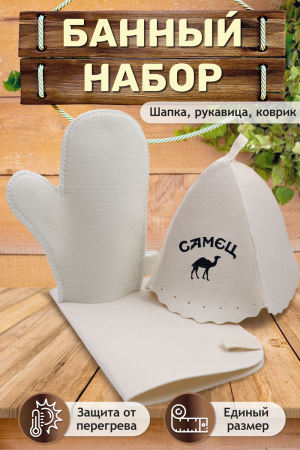 Наш оригинальный набор для бани включает в себя шапку, рукавицу и коврик. Это незаменимые аксессуары для любителей попариться в  бане и сауне. Шапка защитит волосы от сухости и ломкости, голову от перегрева и предотвратит появление головокружения. Рукавицы  – это повышение комфорта при использовании банного веника и безопасность ваших рук от появления ожогов. А индивидуальный коврик защитит от высоких температур при контакте с горячей лавкой в парилке. Оригинальная вышивка выполнена качественно и не сотрётся в процессе использования. На изделиях имеются петельки, с помощью которых их можно повесить на крючок в предбаннике. Такой набор станет отличным подарком для любителей отдыха в бане или сауне.