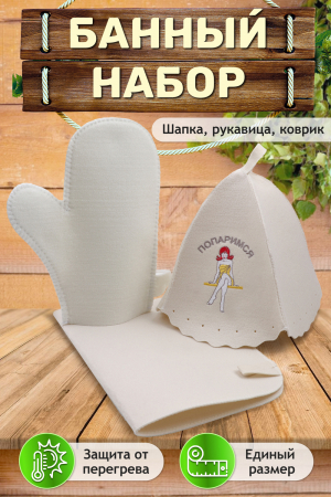 Наш оригинальный набор для бани включает в себя шапку, рукавицу и коврик. Это незаменимые аксессуары для любителей попариться в  бане и сауне. Шапка защитит волосы от сухости и ломкости, голову от перегрева и предотвратит появление головокружения.  Рукавицы  – это повышение комфорта при использовании банного веника и безопасность ваших рук от появления ожогов. А индивидуальный коврик защитит от высоких температур при контакте с горячей лавкой в парилке. Оригинальная вышивка выполнена качественно и не сотрётся в процессе использования. На изделиях имеются петельки, с помощью которых их можно повесить на крючок в предбаннике. Такой набор станет отличным подарком для любителей отдыха в бане или сауне.