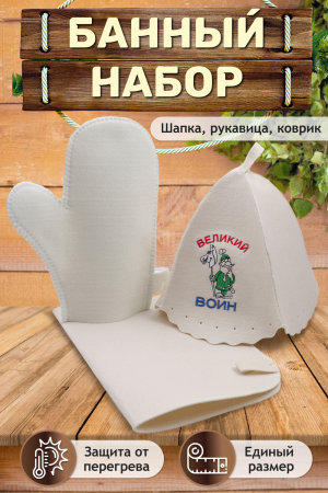 Наш оригинальный набор для бани включает в себя шапку, рукавицу и коврик. Это незаменимые аксессуары для любителей попариться в  бане и сауне. Шапка защитит волосы от сухости и ломкости, голову от перегрева и предотвратит появление головокружения.  Рукавицы  – это повышение комфорта при использовании банного веника и безопасность ваших рук от появления ожогов. А индивидуальный коврик защитит от высоких температур при контакте с горячей лавкой в парилке. Оригинальная вышивка выполнена качественно и не сотрётся в процессе использования. На изделиях имеются петельки, с помощью которых их можно повесить на крючок в предбаннике. Такой набор станет отличным подарком для любителей отдыха в бане или сауне.