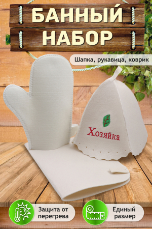 Наш оригинальный набор для бани включает в себя шапку, рукавицу и коврик. Это незаменимые аксессуары для любителей попариться в  бане и сауне. Шапка защитит волосы от сухости и ломкости, голову от перегрева и предотвратит появление головокружения.  Рукавицы  – это повышение комфорта при использовании банного веника и безопасность ваших рук от появления ожогов. А индивидуальный коврик защитит от высоких температур при контакте с горячей лавкой в парилке. Оригинальная вышивка выполнена качественно и не сотрётся в процессе использования. На изделиях имеются петельки, с помощью которых их можно повесить на крючок в предбаннике. Такой набор станет отличным подарком для любителей отдыха в бане или сауне.