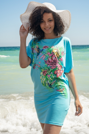 Красивая, универсальная, лёгкая туника свободного фасона. Подходит как для дома, так и для пляжного отдыха. Принт в виде тропической композиции с птичками колибри. Рисунок расположен по диагонали. Длина изделия до середины бедра, свободный, спущенный рукав. Продуманный крой обеспечивает свободу движений и комфорт.