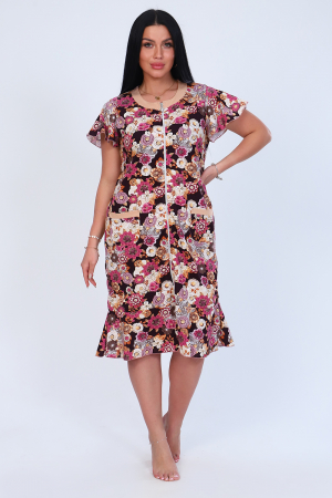 Халат женский домашний из кулирки с принтом длиной ниже колен. Халат полуприталенного силуэта с рельефами. Халат с центральной застежкой на тесьму - молнию. Перед с круглым вырезом и круглым воротником из отделочного однотонного материала с рельефами из линии проймы. С двумя симметричными карманами. Вход в карман прямой из ткани отделки. Рукава втачные короткие.