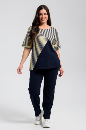Костюм состоит из туники и брюк. Туника прямого силуэта, с округлой горловиной, с удлиненной спинкой, длиной до середины бедра. В нижней части боковых швов обработаны разрезы. Рукав короткий, с манжетом. Горловина обработана бейкой из основного полотна. Брюки на поясе, с боковыми карманами, со стрелками спереди. Вдоль боковых швов брюк расположены лампасы из отделочного полотна.