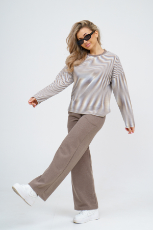 Женский костюм выполнен из двухстороннего флис полара высокого качества. Флис полар - высокотехнологичный материал, прошедшей особую обработку. Ткань отличается высокими теплозащитными свойствами, при этом является дышащей. По своим характеристикам она не уступает шерстяным полотнам. И даже в сыром состоянии удерживает тепло у тела. Материал прочный, эластичный, влагостойкий. Воздухопроницаемая гигроскопичная ткань создает для тела комфортный микроклимат. Материал гипоаллергенный, подходит для изготовления одежды детям, в том числе новорожденным. Изделия из флиса легкие, не мнутся, не деформируются, не вытягиваються.В такой одежде удобно и комфортно. Эластичность материала позволяет легко двигаться. Костюм состоит из лонгслива и брюк. Лонг в стиле OVERSIZE ( одежда свободного кроя ) - это свобода самовыражения, позволяющая чувствовать себя комфортно и стильно одновременно. Горловина футболки выполнена с обтачкой. Линия плеча спущена, длинный рукав. Женские стильные брюки - трубы представлены с вместительными боковыми карманами. Пояс выполнен на специализированной круговой поясной машине, что делает швы ровными и качественными. А профессиональные закрепки на поясе, придают изделию законченный вид и качество. Свободный крой прекрасно будет смотреться на дамах с любыми формами. Костюм такого плана представлен в широкой размерной сетке, что позволяет выбрать его как девушке, так и женщине. Костюм модных расцветок с полосой, будет удачным выбором для поездок в отпуск, на пикник, для школы, для активного отдыха и прогулок по городу. Будет гармонично сочетаться как с кроссовками, так и с ботинками. Используя эту модель в качестве домашнего костюма, Вы поймёте, что это именно тот самый идеальный вариант, в котором будете себя чувствовать удобно, комфортно и современно. Костюм с брюками - это настоящая находка для тех, кто ценит свою индивидуальность!