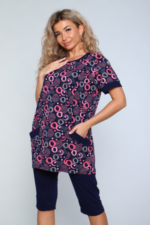 Костюм состоит из туники и бридж. Бриджи с карманами, длиной ниже колена. Туника с короткими рукавами на манжетах. Полочка с отрезными бочками и накладными карманами. Неотъемлемый элемент домашнего гардероба.