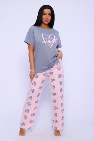 Костюм женский с оригинальным принтом в виде сердечек, из кулирки. Комплект состоит из футболки прямого кроя с рельефным пафф-принтом и прямых брюк на резинке с боковыми карманами. Футболка со спущенной фигурной проймой и свободным, слегка присборенным коротким рукавом. Домашний костюм из дышащего хлопкового трикотажа, комфортный, удобный, необходимая вещь для дома, а так же для сна.