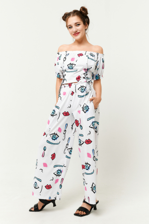 Костюм женский для летнего отдыха, состоит из укороченного топа и широких брюк с завышенной талией на широкой резинке.