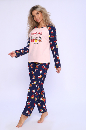Костюм домашний состоит из кофты с длинным рукавом и брюк. Брюки с карманами. Кофта с рукавами - реглан и принтом. Удобный и практичный вариант для дома и сна.
