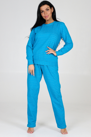 Легкий женский костюм прямого силуэта. Двойка выполнена в свободном стиле. Свитшот с округлой горловиной, на рукавах манжеты, снизу на кофте пояс. Брюки достаточно просторные, с поясом на резинке и с боковыми карманами. Комплект идеально подойдет для повседневной жизни, домашних дел и прогулок.