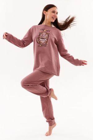 Уютный удобный костюм из футера с начёсом. Удлинённый лонгслив свободного кроя с оригинальным принтом. Джоггеры с высокой посадкой, прямого свободного кроя, слегка зауженные к низу. Имеют внутренние карманы. Пояс обработан на поясной машине, поэтому резинка не скручивается при эксплуатации. Манжеты и горловина изготовлены из качественной резинки - рибаны в цвет основной ткани. В измерении обхвата талии указан размер резинки, которая без проблем растягивается до стандартных значений фигуры. Этот костюм можно использовать в повседневной носке, а так же комфортно находиться в домашней обстановке.