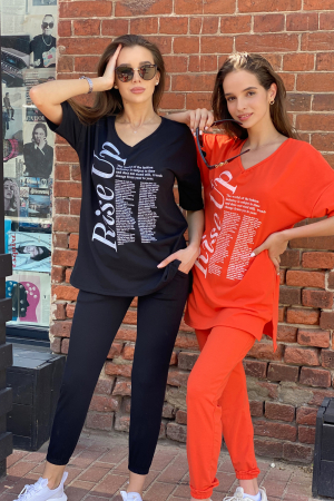 Комплект состоит из туники и брюк. Туника прямого силуэта, с V-образной горловиной, с удлиненной спинкой, с разрезами в нижней части боковых швов. Рукав короткий. Горловина обработана бейкой из основного полотна. Брюки длинные, с карманами, с кокеткой сзади, на эластичном поясе. Низ брюк на резинке.