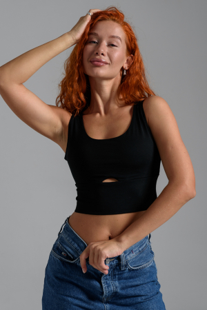 Модный топ для девушек, которые следят за трендами в моде. Стильный базовый элемент одежды в повседневной носке или пляжный на море. Топ с глубоким вырезом зоны декольте. Облегающего покроя. Дышащий материал майки хорошо тянется и не стесняет движений, не просвечивает. Топик можно использовать как для физкультуры, фитнеса, занятия по танцам или йоге, для спорта, бега. Двойной слой однотонной ткани и мягкие швы делают изделие комфортным и приятным к телу. Актуален для создания многослойных трендовых образов.