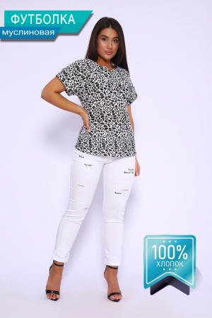 Легкая удобная футболка из муслина. Стопроцентный хлопок в составе ткани делает изделие незаменимым в летнюю жару и на работе, и на отдыхе. Спущенный рукав с небольшим манжетом обеспечивает свободу движения, округлая горловина с V-образным вырезом добавляет женственности образу. Длина футболки до линии бедра.