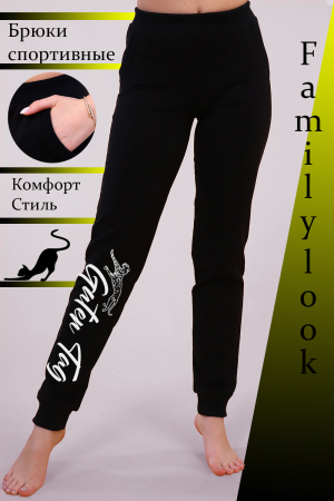 Брюки женские с манжетами (серия фэмили лук). Данная модель выполнена из трикотажного полотна футер 2-х нитка, манжета, пояс и вход в карман выполнены из эластичного трикотажного полотна кашкорсе. На передней половинке присутствует принт. Отличная модель для прогулок и повседневной носки. Такая же модель 15245 порадует не только вас, но и вашу дочь