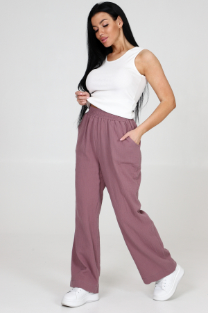 Брюки женские из муслина свободного покроя, на притачном поясе и с боковыми карманами.