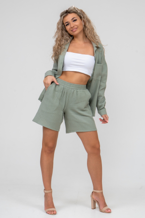 Модные женские шорты - бермуды с завышенной линией талии выполнены из легкого струящегося двухслойного муслина с жатой структурой. Одежда из ткани муслин - это новинка и тренд сезона. Пояс шорт выполнен на специализированной поясной машине, что добавляет изделию большую износостойкость и эстетический внешний вид. По бокам, для удобства, расположены вместительные карманы. Изделие из муслина имеет много положительных качеств: нежность и лёгкость, высокая прочность, воздухопроницаемость. Легкие хлопковые шорты с высокой посадкой создадут модный образ для любой девушки. С шортами из муслина Вы создадите себе, как спортивный или повседневный образ на выход, так и универсальный вариант для дома и сна. Стирать муслиновые вещи нужно только в тёплой воде при температуре не выше 40С.
