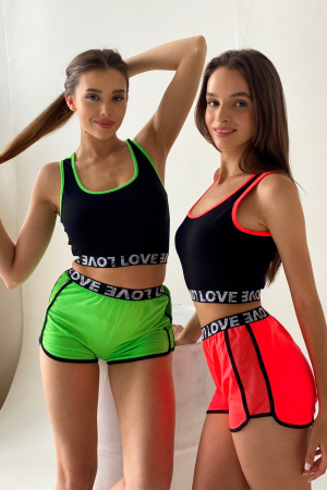 Шорты в спортивном стиле полуприлегающие, короткие, на декоративной резинке, с фигурным низом. Вдоль боковых швов расположены вставки из сетки. Низ шорт обработан бейкой из отделочного полотна.