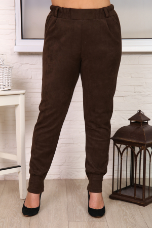 Брюки женские. Ткань замша эластичная, плотная. Брюки на поясе с резинкой по бовам и шлевками под ремешок. Гульф-имитация, карманы внутренние. Спереди по низу брюк по две складки-защипы. Талия завышена. Очень удобная посадка.