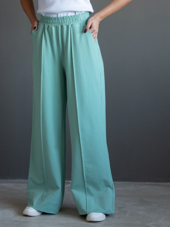 Широкие женские брюки-палаццо. Пояс отрезной в цвет изделия, выполнен из основного полотна, с эластичной тесьмой внутри. По поясу брюк отстрочка на поясной машине, нитки в цвет изделия. По центру передней половинке брюк защип с отделочной строчкой. На изделии выполнены карманы с отрезным бочком и отлетной мешковиной, вход в карман обтачной. Низ изделия обработан швом вподгибку. Модель рассчитана на рост 164-170