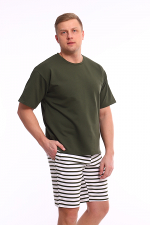 Комплект состоит из футболки оверсайз и шорт. Футболка свободного кроя, с коротким рукавом, круглым вырезом горловины. Шорты прямого кроя с карманами, на поясе шнур для регулировки .