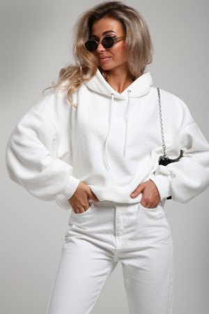 Уютный, женский свитшот с капюшоном, из ультра мягкого, нежного и легкого интерсофта в виде барашка, изнаночная сторона ткани гладкая, без начеса. Данная фактура и плотность ткани не дает лишних объемов. Капюшон с кулисой в которую продет шнурок, горловина обработана отделочной строчкой. Рукава широкие втачные, плече спущенное по низу рукава и низу изделия пришито кашкорсе. Изделие лаконичное, без лишних деталей, подойдет как для спортивных и расслабленных образов, так и в сочетании с более классическими предметами гардероба. На фото модель представлена в 46 размере. В зависимости от партии дизайн шнурка может меняться.