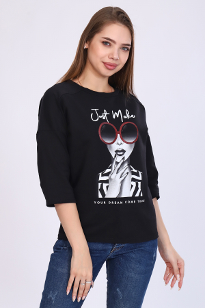 Джемпер женский с ярким, оригинальным принтом из мягкого футера с лайкрой 2-х нитка. Модель слегка приталенного силуэта, круглая горловина обработана обтачкой, спущенная пройма, свободный 3/4 рукав, на спинке кокетка, низ слегка удлинён и закруглён. Стильный, комфортный джемпер необходимая вещь в гардеробе деловой, современной девушки, отличный офисный вариант, хорошо будет смотреться как с брюками, так и с юбкой.
