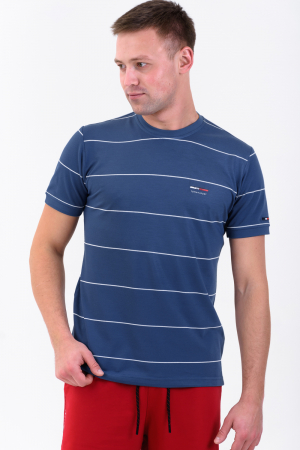 Футболка мужская в мелкую полоску. Круглый вырез горловины, рукав на манжете. На груди небольшой принт