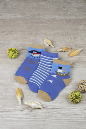 Носки с вязаными рисунками в виде кораблика, полосок и пирата для детей. В комплекте 3 пары с разным дизайном, по 1 каждого вида. Состав ткани: 80% х/б, 17% п/а, 3% эластан. Возможен заказ в розницу. Арт. НД280