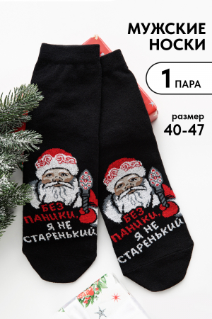 Оригинальные мужские новогодние носки. В комплекте 1 пара. На основной части носка изображение Дед Мороза и надпись Без паники. Я не старенький.