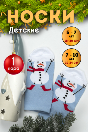 Новогодние детские носки. На основной части носка яркой изображение снеговика.