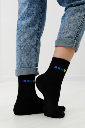 Детские носки с изображением разноцветных квадратиков на паголенке. В комплекте 3 пары одного цвета.
