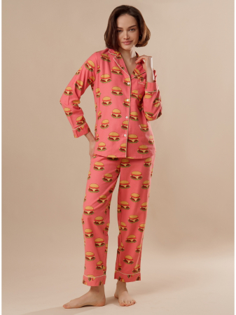 Домашняя пижама от торговой марки Индефини. В комплекте рубашка и брюки. Рубашка из хлопка, оранжево-персикового цвета, с принтом, с длинными рукавами, с воротником-отворотом, с кармашком на груди, с обрамлением, на пуговичках, прямая, свободного кроя. Брюки из хлопка, оранжево-персикового цвета, с принтом, прямые, свободного кроя, с обрамлением, на мягкой резинке, с регулирующей лентой.