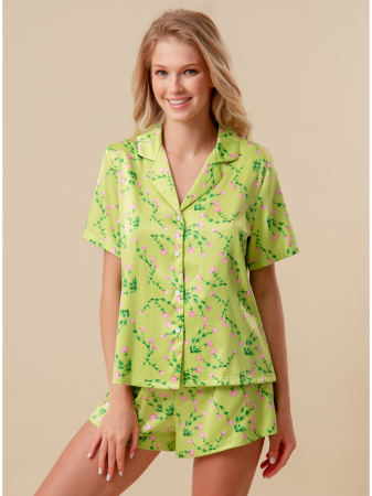 Домашняя пижама от торговой марки Индефини. В комплект входит рубашка и шорты. Рубашка из полиэстера, зеленого цвета, с цветочным принтом, с короткими рукавами, с воротником-отворотом, на пуговичках, прямая, свободного кроя. Шорты из полиэстера, зеленого цвета, с цветочным принтом, с обрамлением, прямые, свободного кроя, на мягкой резинке, с регулирующей атласной лентой.