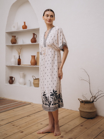 Пляжная туника, изготовленная из вискозной ткани, выполнена в классическом белом цвете. Имеет прямой свободный крой, короткие рукава и V-образный вырез в области декольте. Обхват груди регулируется шнурком. Туника украшена принтом.